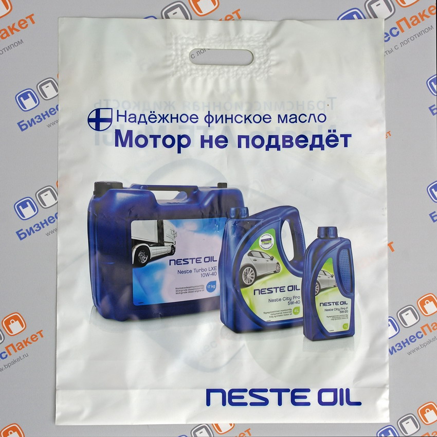 Пакеты с вырубной укрепленной ручкой используют крупные автосалоны и магазины элитных моторных масел. Такие пакеты для автосалонов выглядят солидно и красиво, при этом являясь весьма прочными благодаря повышенной плотности ПВД – 70-80 мкм.