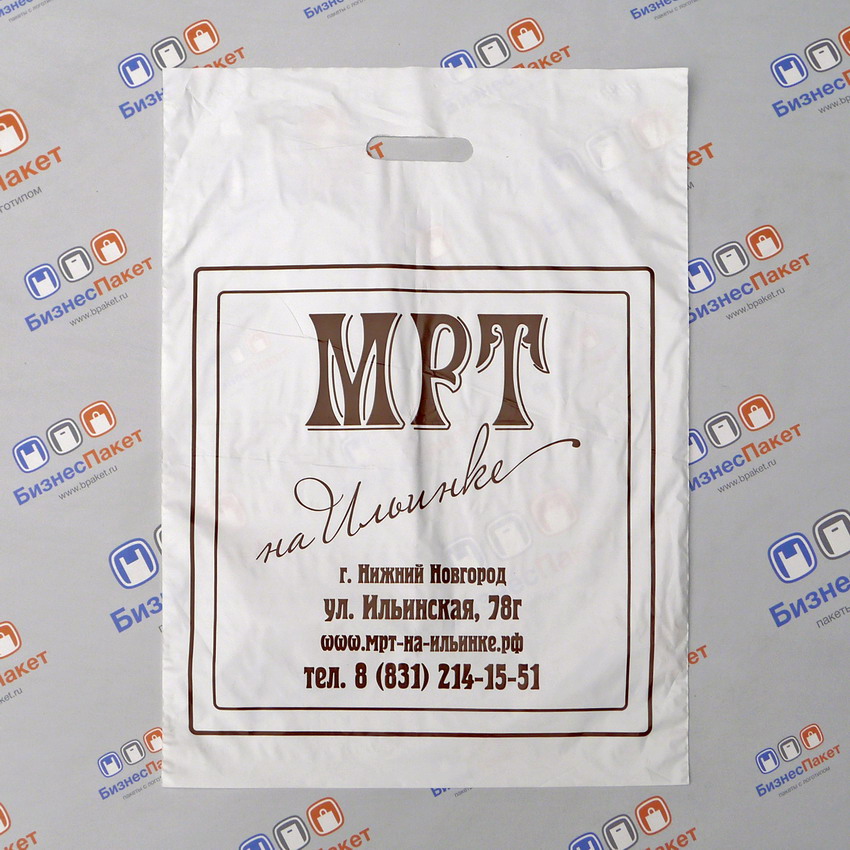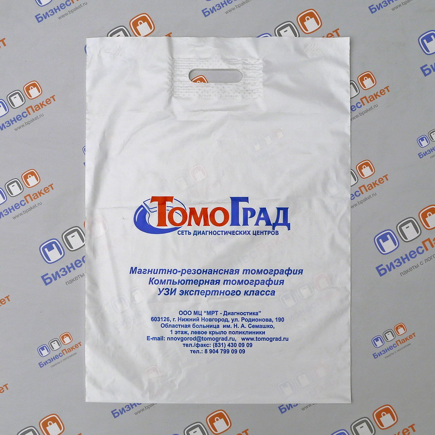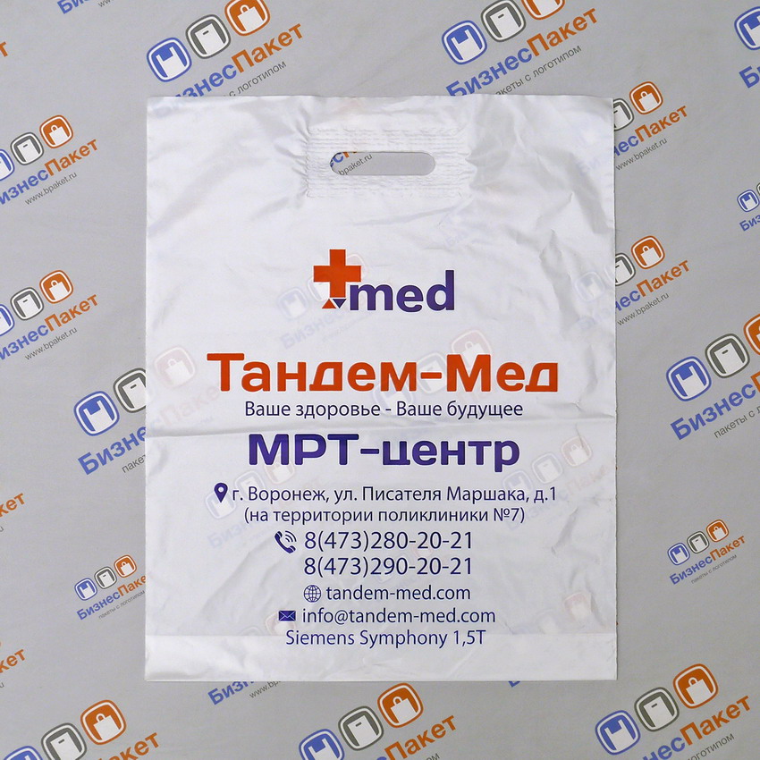 Пакеты с вырубной ручкой – оптимальный вариант для медицинских центров, центров МРТ и стоматологических клиник. Такие пакеты с логотипом удобны для переноски документов и снимков, выглядят солидно, долговечны и являются отличной рекламной площадкой. Медицинские центры, в которых не предоставляются услуги МРТ, а также стоматологические клиники, чаще заказывают пакеты с вырубной ручкой небольшого размера 30х40+3 см. Медицинские центры с МРТ используют пакеты, размер которых наиболее подходит для размещения снимков. Это пакеты для МРТ размером 40х50+3 см или более длинные 40х54+3 см. Пакеты для медицинских центров производят из гладкого и блестящего ПВД минимальной толщины 50 мкм. Для снижения стоимости пакета в качестве материала можно использовать более матовый и шуршащий ПНД толщиной 35-45 мкм. Также не всегда производится укрепление ручки, поскольку вес вложений небольшой и нет необходимости в высокой грузоподъемности.
