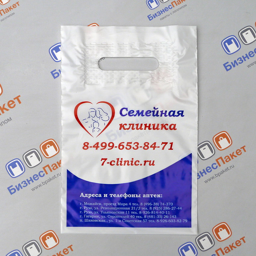Пакеты с вырубной ручкой – более популярное решение, подчеркивающее солидность клиники. В частности, пакеты с вырубной ручкой используются для снимков МРТ и другой медицинской документации. Материалом служит ПВД толщиной 50 мкм или более экономичный ПНД толщиной 35-45 мкм. Наиболее популярны пакеты для медицинских центров размером 30х40+3 см и 40х50+3 см.