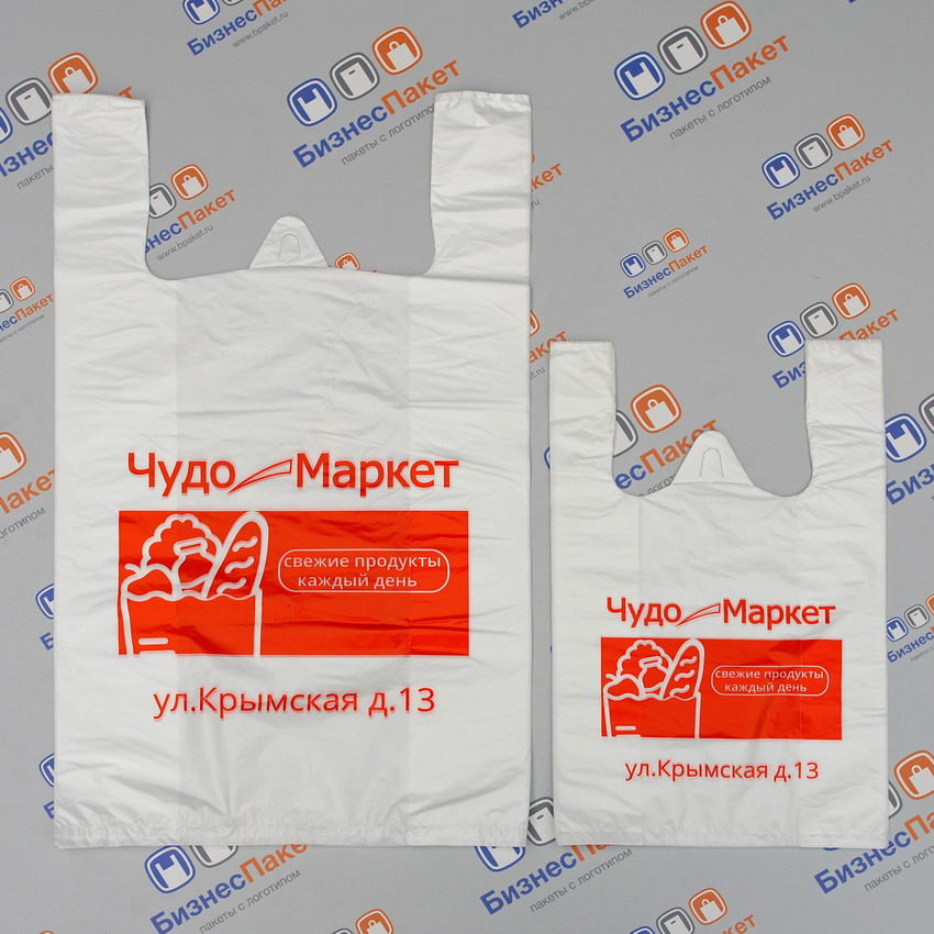 Крупные магазины продуктов и супермаркеты часто заказывают несколько размеров и видов пакетов для продуктов – обычные пакеты Майка для небольших покупок, большие пакеты Майка для объемных покупок и пакеты с вырубной ручкой для тяжелых товаров или как имиджевый вариант.