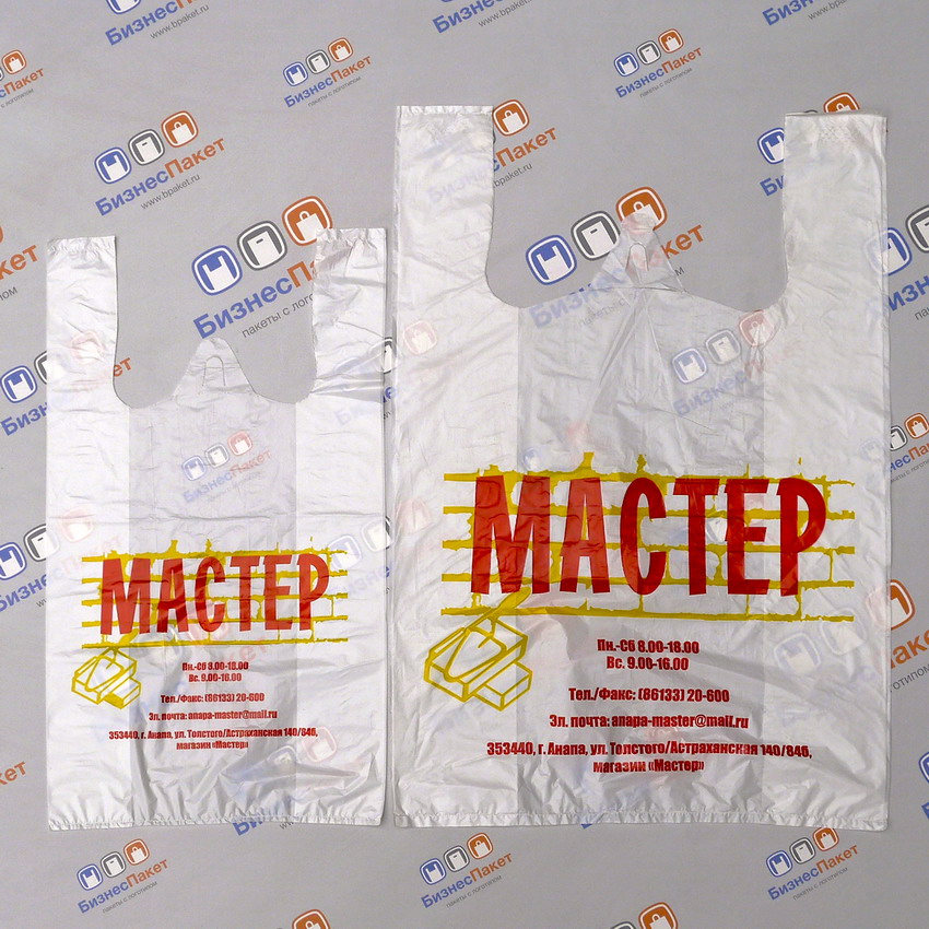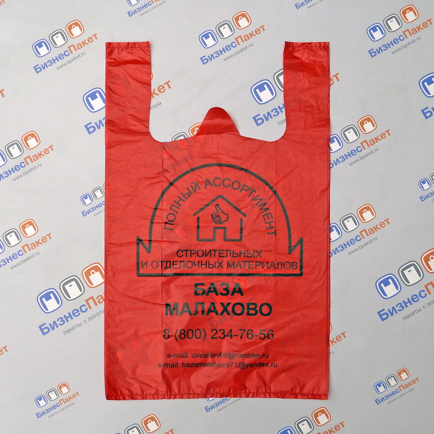 Пакеты Майка для стройматериалов экономичны, вместительны и достаточно прочны. Размеры пакетов с логотипом для магазинов стройматериалов и инструментов зависят от ассортимента – небольшие магазины фурнитуры, инструментов, метизов предпочитают пакеты 28х50 см толщиной 18 мкм, наиболее популярен средний размер пакета 30х60 см плотностью 20 мкм, крупные магазины и базы стройматериалов используют большие пакеты размером 42х70 см и толщиной 25 мкм. Недостатком пакетов Майка является то, что у них есть высокий риск порваться при переноске товаров с острыми углами и режущими кромками, а такие товары в ассортименте магазинов стройматериалов встречаются довольно часто.