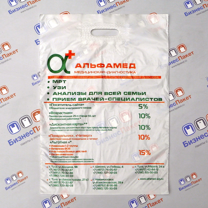 Пакеты для медицинских центров, центров МРТ и стоматологических клиник предназначены для документов, снимков МРТ и товаров медицинского назначения, которые продаются в данном учреждении. Это определяет их размеры и другие особенности.