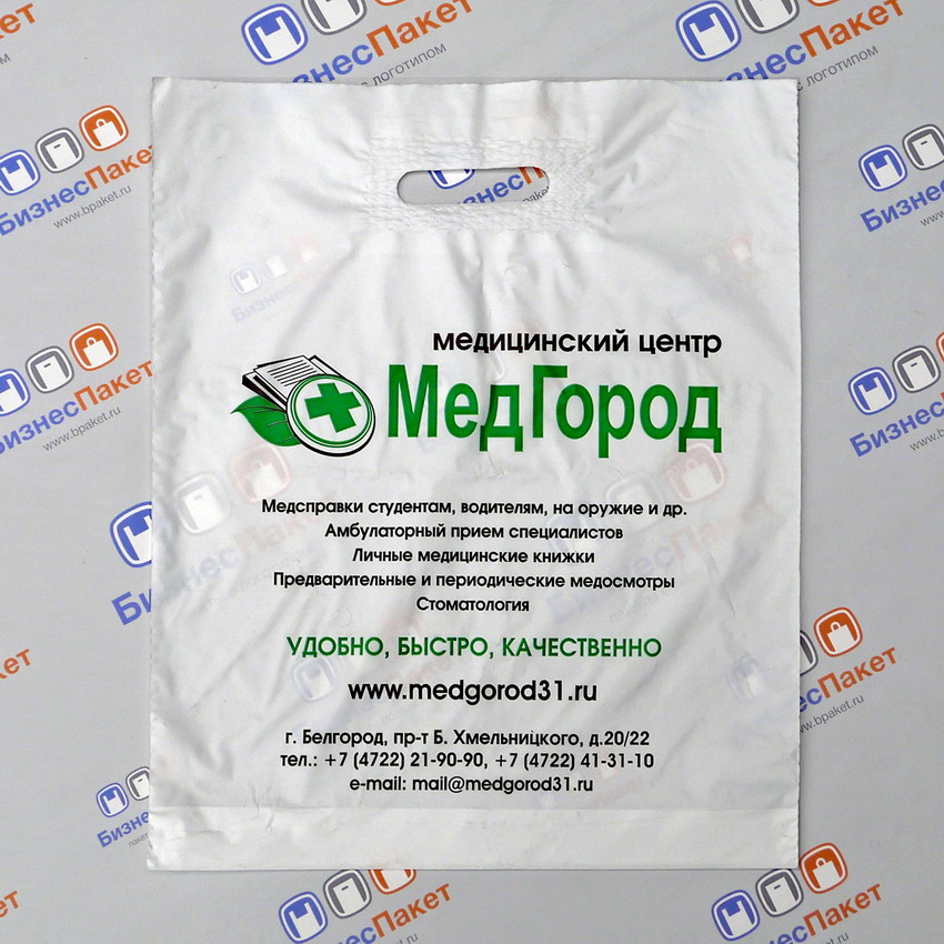 Пакеты с вырубной ручкой – более популярное решение, подчеркивающее солидность клиники. В частности, пакеты с вырубной ручкой используются для снимков МРТ и другой медицинской документации. Материалом служит ПВД толщиной 50 мкм или более экономичный ПНД толщиной 35-45 мкм. Наиболее популярны пакеты для медицинских центров размером 30х40+3 см и 40х50+3 см.
