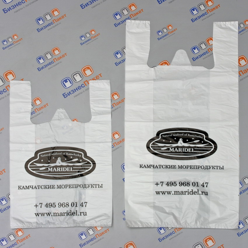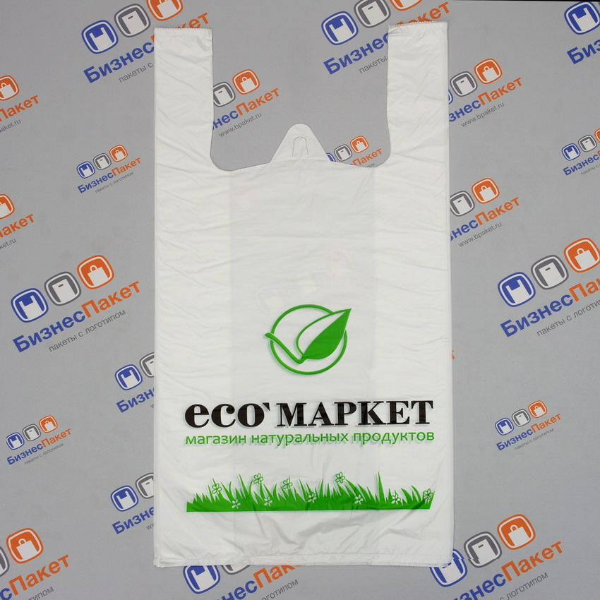 Самый популярный пакет для магазина продуктов или супермаркета – это пакет Майка с логотипом. Для небольших покупок подойдёт недорогой пакет Майка размером 28×50 см из ПНД толщиной 14-15 мкм. Пакеты для кондитерских магазинов и пекарен часто бывают среднего размера 30х60 см. А для объёмных товаров или большого количества покупок нужен прочный и вместительный пакет для супермаркета размером 38×65 см или даже больше. Рекомендуемая толщина большого пакета Майка для продуктов – 16-18 мкм и более.