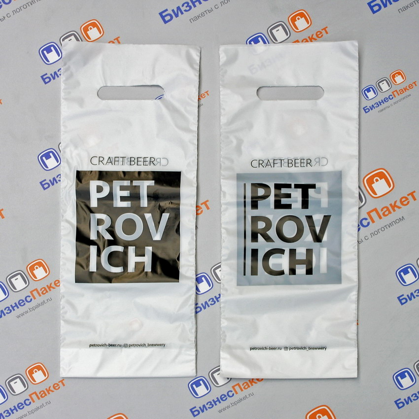 - Пакеты для пива с логотипом из ПНД для литровых, полутора- и двухлитровых пивных бутылей с ручками и без.