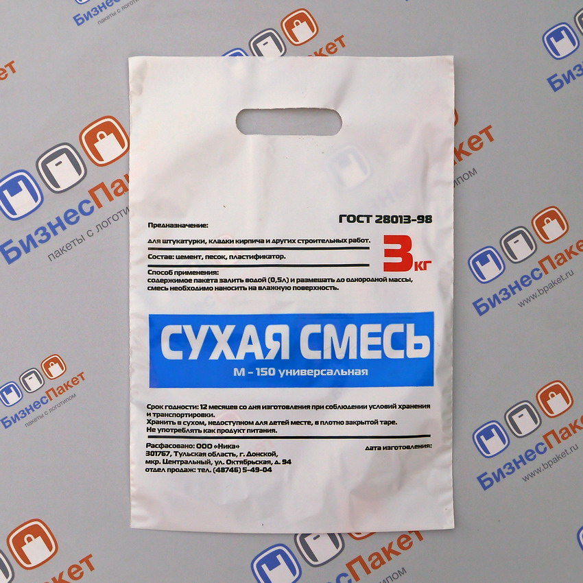 - Готовые сформированные упаковочные пакеты с логотипом заданных размеров и конструкции (с донной складкой или без, с вырубкой ручки или без, мешки различных размеров и т.п.). Например, пакеты для строительных смесей, мешки для наполнителей, пеллет, кормовых смесей и другое.
